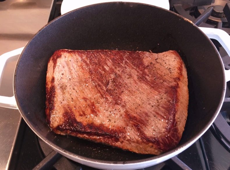 1. Preheat oven to 325 degrees. Â In a Dutch-oven or large oven proof pot, add 1 tablespoon of oil and place over medium-high heat. Â Salt and pepper brisket on both sides and add it to pan. Â Sear brisket on both sides for 4 minutes.