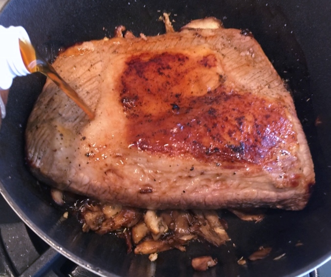 Brisket makes a great family-style meal on the weekends, especially at the holidays when you’re feeding a crowd, or having a large dinner party. The simplicity of searing this lean piece of meat and roasting it for several hours in the oven is truly amazing. The tender beef becomes easy to slice, but not too soft that it falls apart. Â I love roasting brisket with vegetables, and this time around I chose hearty wild mushrooms, to create a warm broth, that compliments the meat.