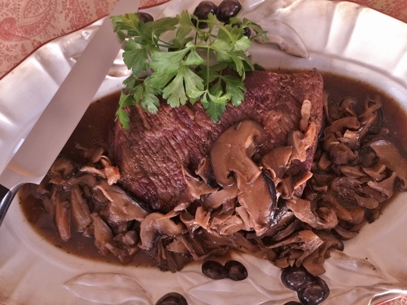 5.  Remove meat from oven and place it on a serving platter.  Ladle mushrooms and broth over top. Slice and serve family-style on table.  Enjoy!