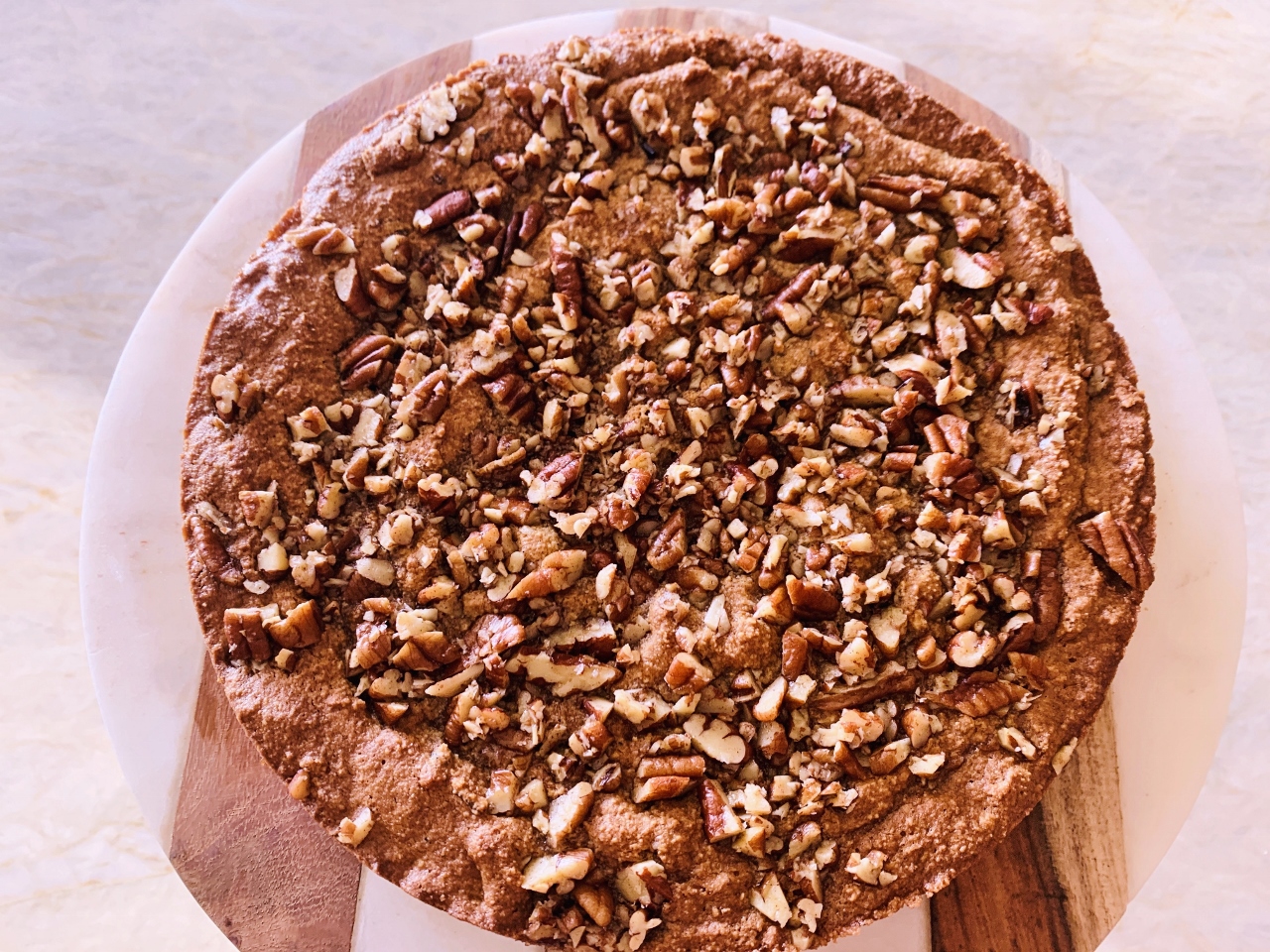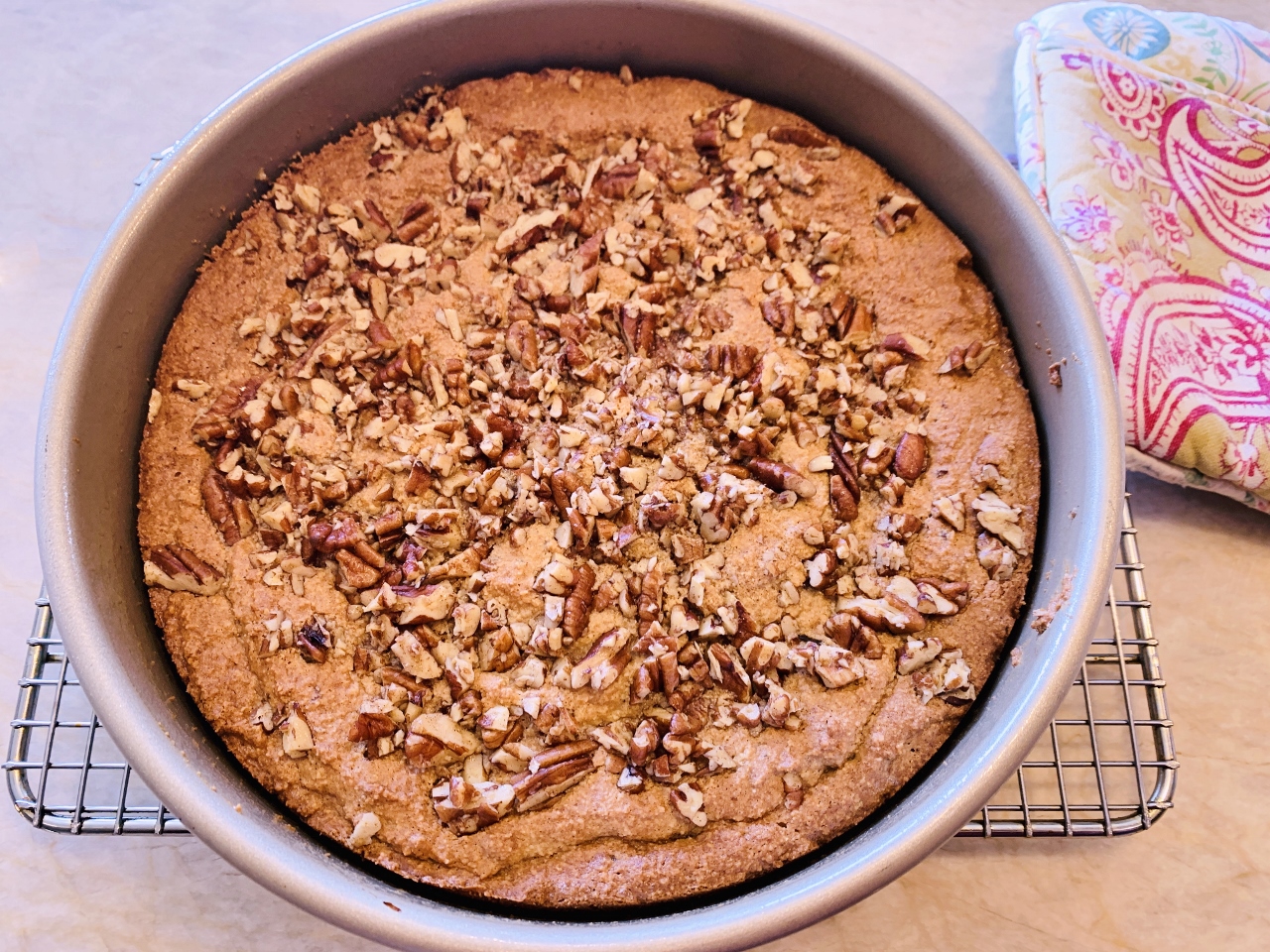 - Spoon batter into prepared pan. Sprinkle pecan on top and bake in oven for 25-28 minutes, or until golden brown. Remove cake from oven and let cool in pan for 20 minutes.