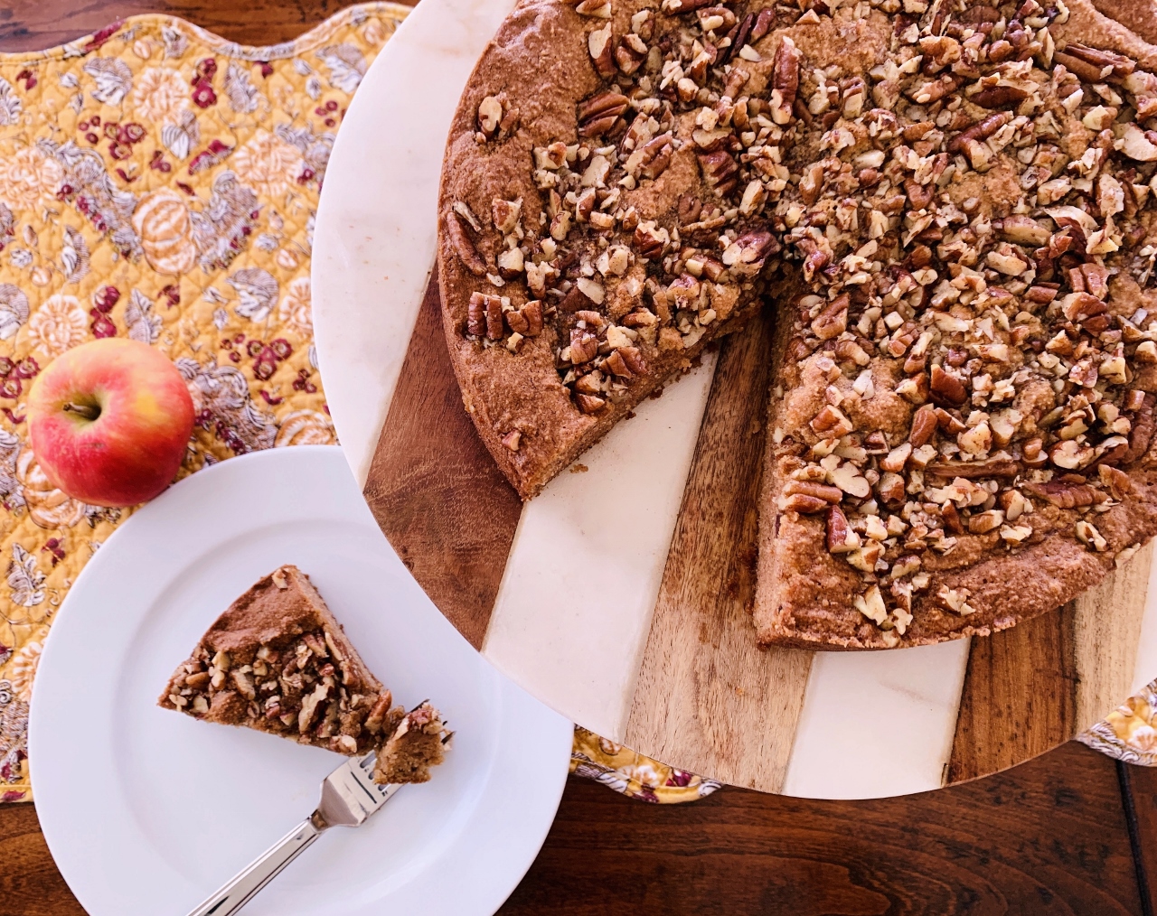 Making a paleo cake with apple and pecans follows tradition at the holidays and certainly has fall-like flavors. I love the simplicity of the recipe and the fact that it’s super moist with a tender crumb, even without using all-purpose flour. The entire cake is whirled up in a food processor and baked in one pan for a single layer cake that can be served for dessert, or in the afternoon with a warm cup of tea or coffee. The ingredients are also things you probably have in your pantry or refrigerator, so there’s no need for an extra trip to the grocery store. I think your family won’t be able to tell this cake is actually Paleo, it’s just simply delicious.
