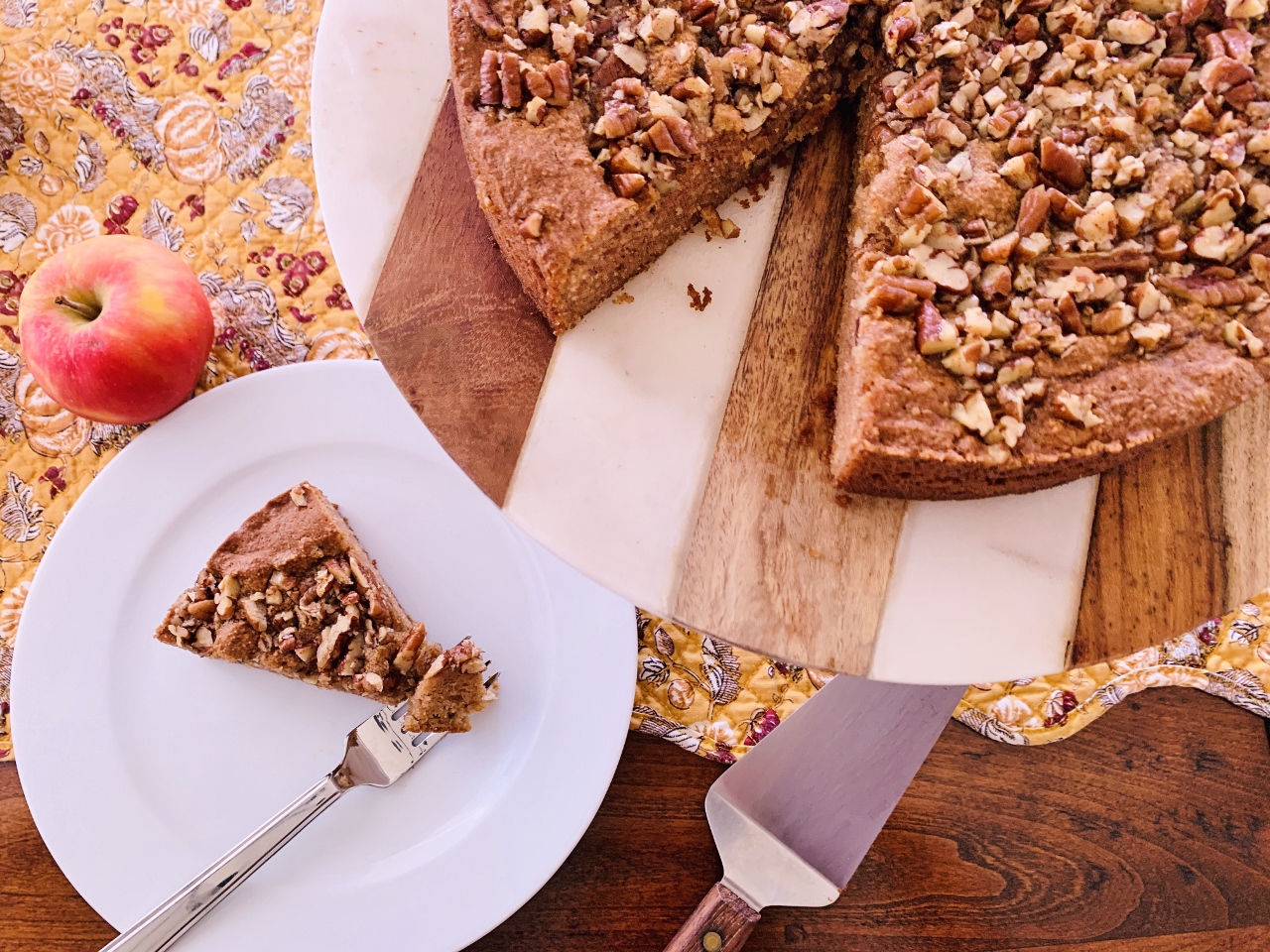 Making a paleo cake with apple and pecans follows tradition at the holidays and certainly has fall-like flavors. I love the simplicity of the recipe and the fact that it’s super moist with a tender crumb, even without using all-purpose flour. The entire cake is whirled up in a food processor and baked in one pan for a single layer cake that can be served for dessert, or in the afternoon with a warm cup of tea or coffee. The ingredients are also things you probably have in your pantry or refrigerator, so there’s no need for an extra trip to the grocery store. I think your family won’t be able to tell this cake is actually Paleo, it’s just simply delicious.