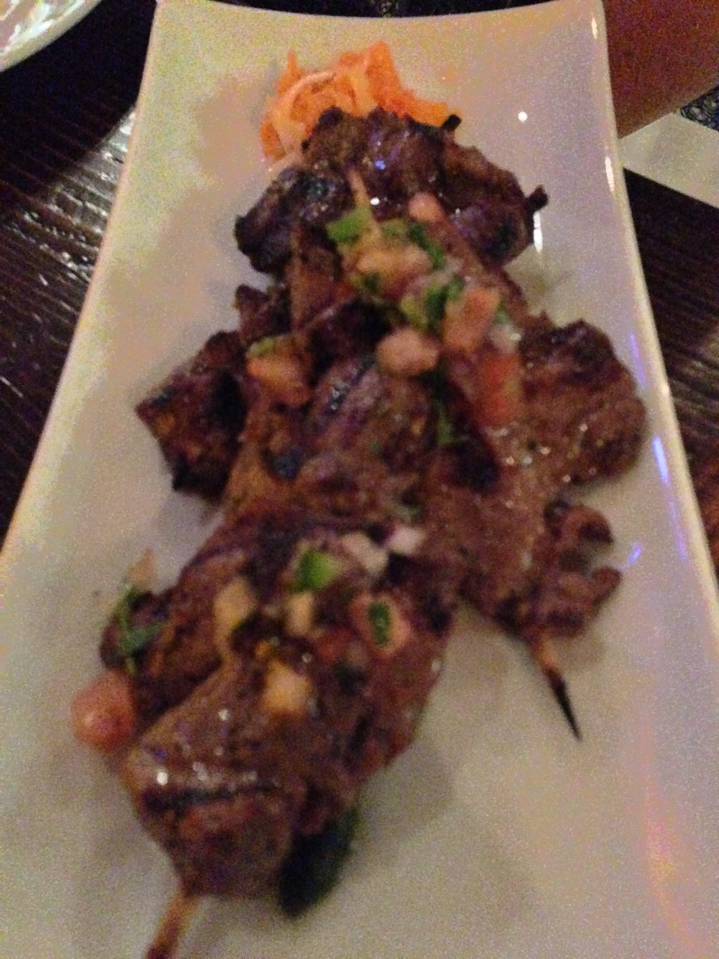 The menu looked appealing with Spanish American appetizers and entrees. We began our dinner with a hot pot of Queso Fundido with chorizo and cilantro, but I couldn’t taste a crumb of chorizo and the flavor fell flat for the entire table. Next, the Anticuchos de Carne were Brazilian Spiced Beef Skewers that tasted amazing. The smokiness of the meat was incredible and the chimichurri added another level of herbiness to the dish.