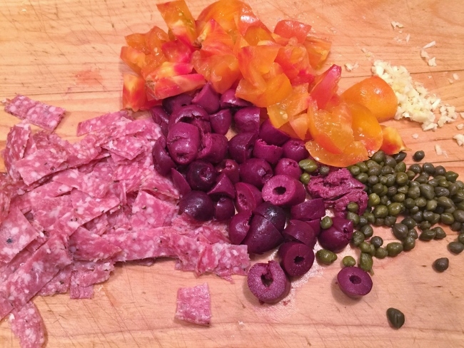 1.  Boil pasta for 10 minutes, reserving 1/2 cup pasta water.  Drain and set aside. Dice tomatoes and rough chop olives.  Mince garlic, slice salami into strips and rinse capers.