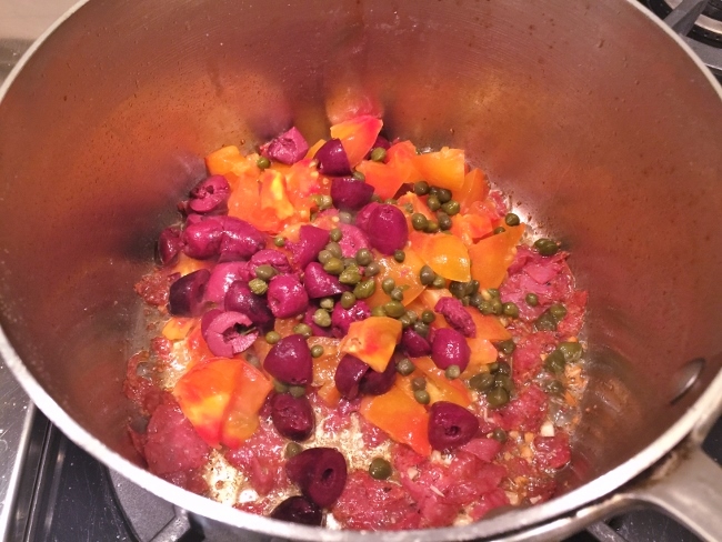 2.  In a medium saucepan, add 1 tablespoon of olive oil and salami.  Place over medium heat and cook for 2 minutes, while stirring.  Add garlic and continue to cook for 1 minute.  Add tomatoes, olives and capers and stir to combine, cook for 2 minutes.