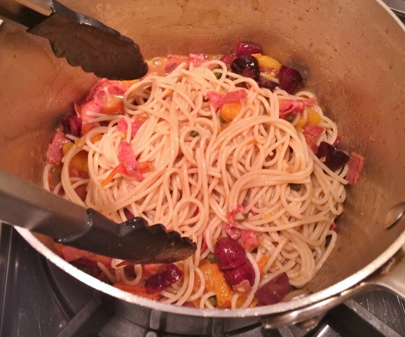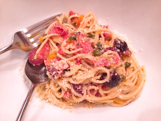 Pasta is a comfort food that makes us feel good, and during the week when we’re looking for something super satisfying to make for dinner, but without a lot of fuss, pasta seems to be a smart choice.  Pasta Puttanesca is a simple spaghetti dish with olives, capers and tomatoes.  This combination of the tangy ingredients boosts dried pasta to a whole new level and with the addition of salami, it becomes even more delicious.
