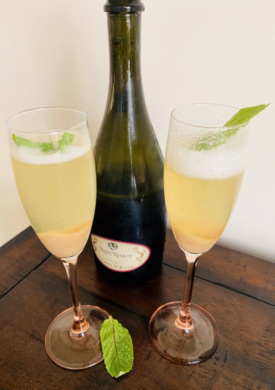 - Spoon 1/4 of puree into each glass, top with Prosecco. Using a long spoon, stir to combine. Top with mint and serve. Enjoy!