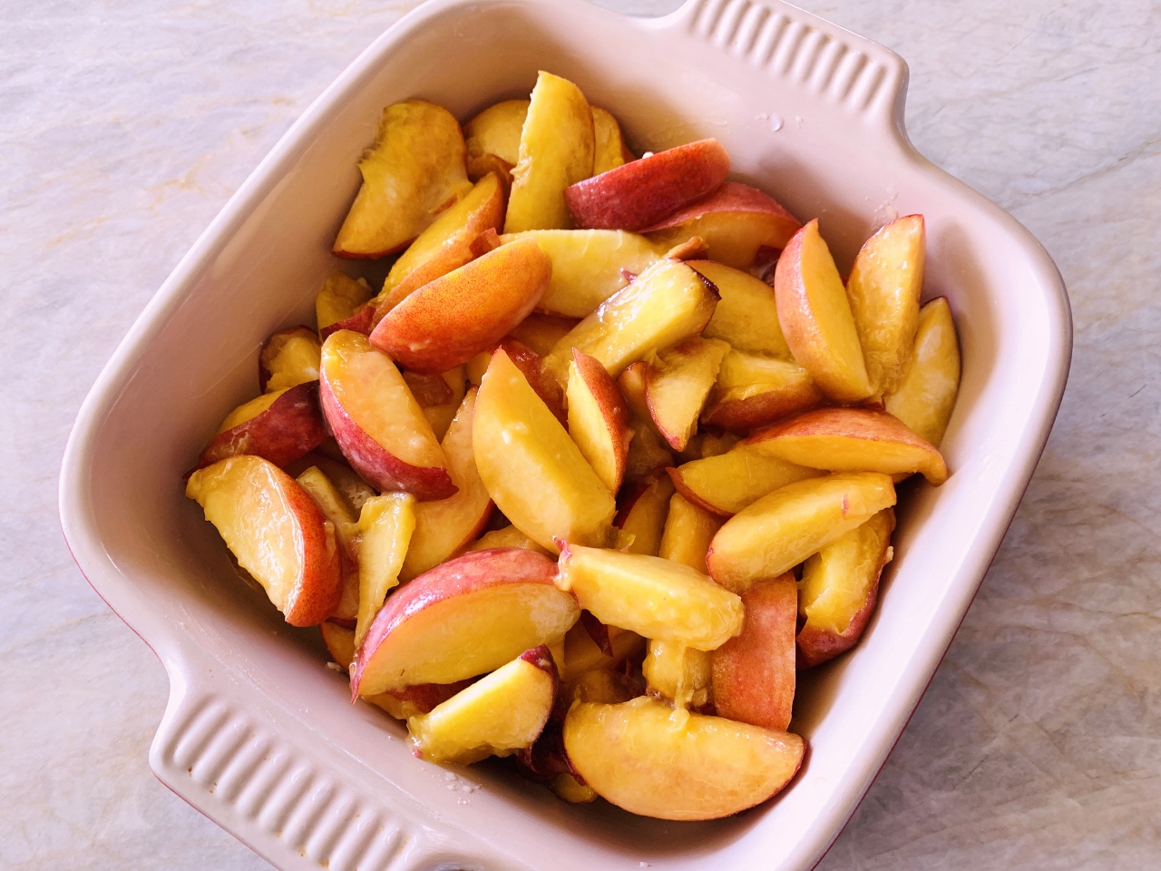 1. Preheat oven to 350 degrees.  Grease 9 x 9 baking dish, set aside.  In a large bowl, combine Filling ingredients.  Toss to coat peaches and pour into prepared dish.