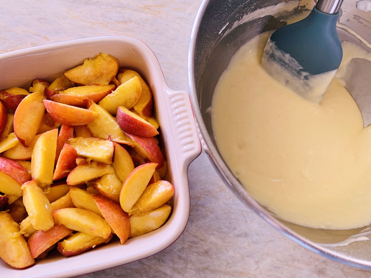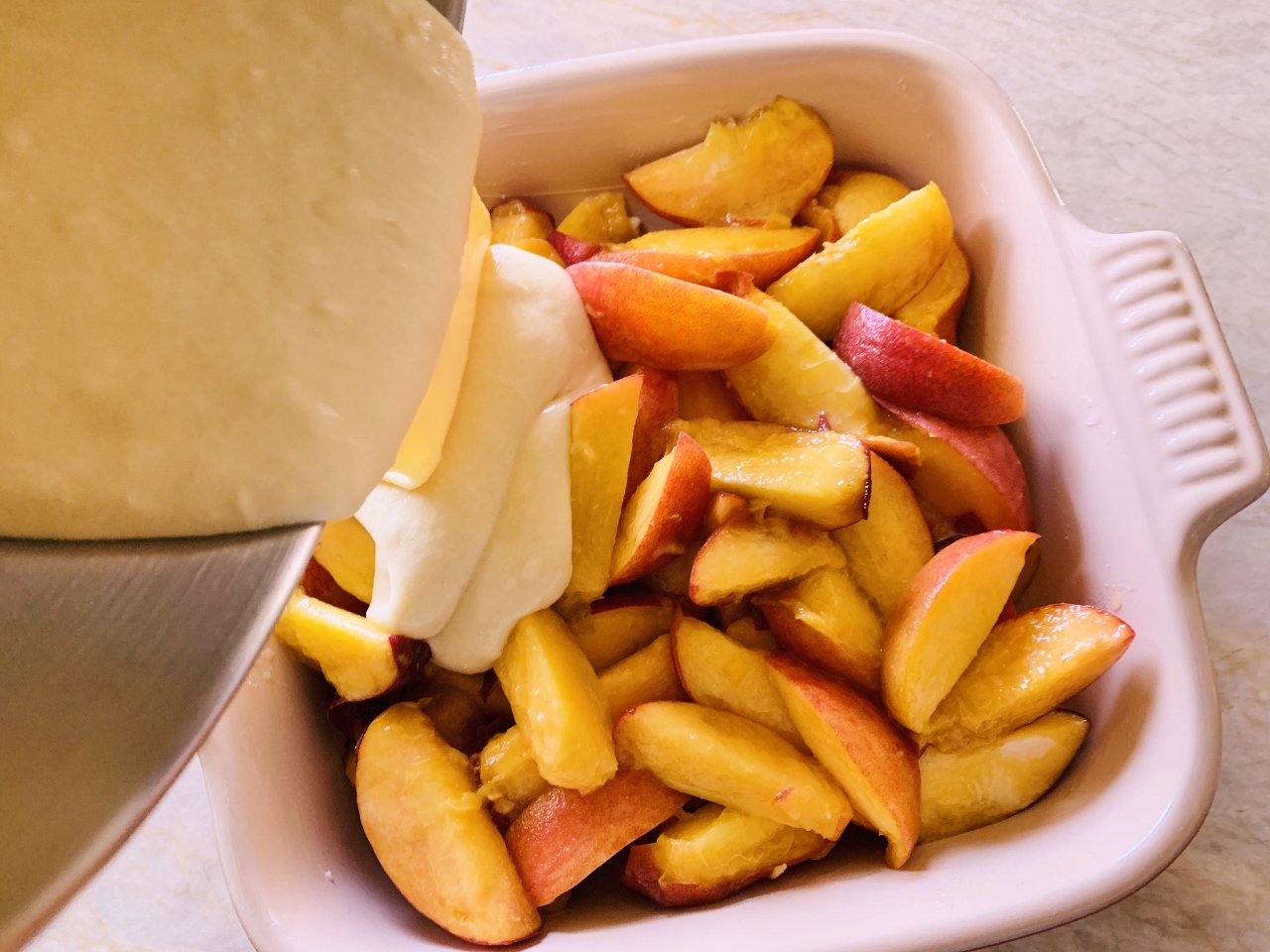 3. Pour batter over peach mixture and bake in oven for 40-50 minutes, or until slightly puffed, but not brown.
