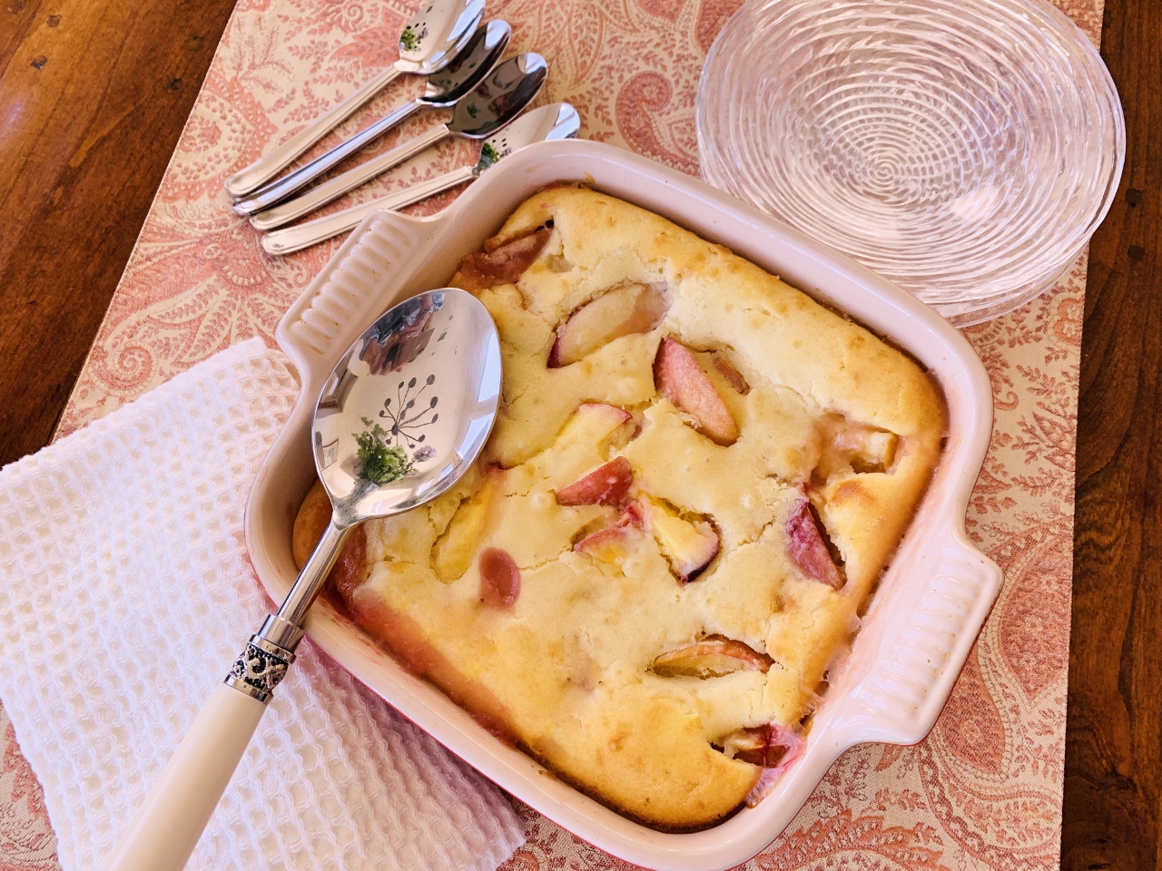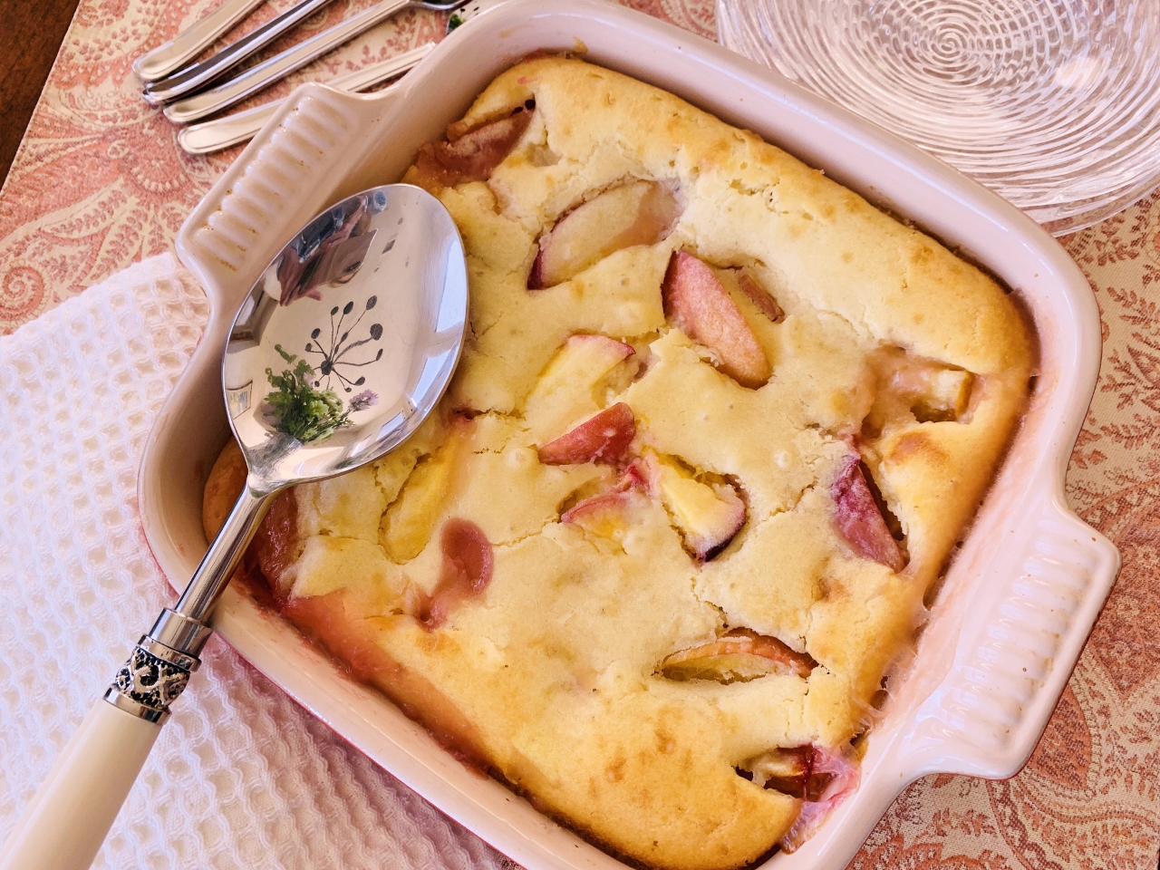 This simple cake recipe made with sliced peaches, is similar to a cobbler, but it’s more of a spoon-cake because of the loose batter.  After slicing peaches into wedges, a simple cake batter is poured over the top before baking.  This summertime dessert can be spooned from the dish at room temperature, or slightly warm, directly to plates, and served with a dollop of whipped cream or ice cream, if desired.  It’s great to serve at backyard barbecues, or after a simple dinner just because it’s stone-fruit season.