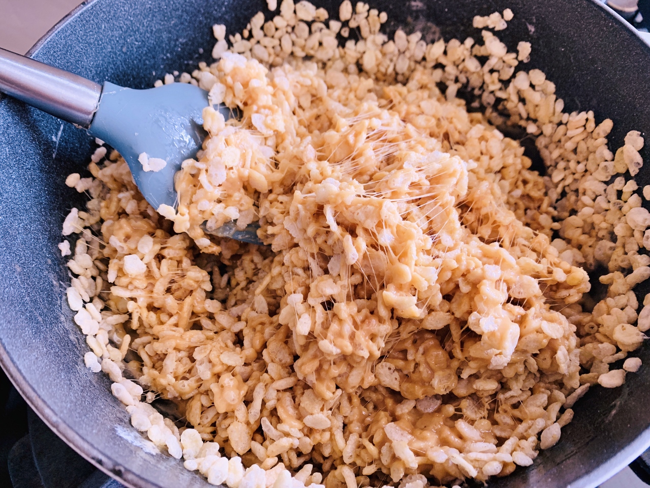 - Spray or grease a 9 x 9 inch baking pan, set aside. In a large saucepan or Dutch oven, add butter and place over medium heat. After butter is mostly melted, add marshmallows and salt. Stir to combine and use lid to cover pot for a few minutes at a time – allowing marshmallows to melt easier. Stir until smooth and add peanut butter. Stir to combine and then, add Rice Krispies cereal, stir.