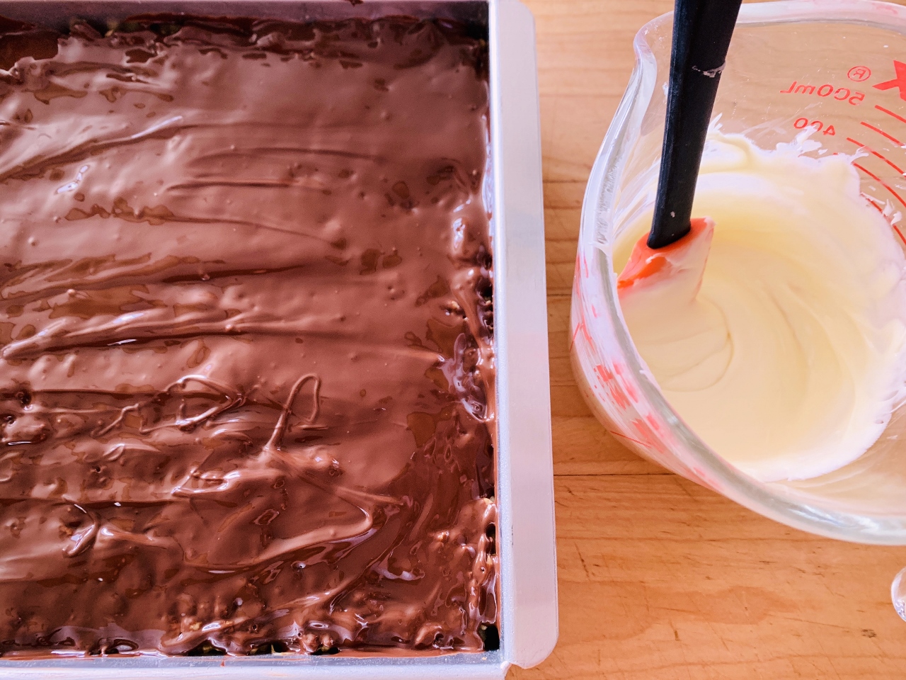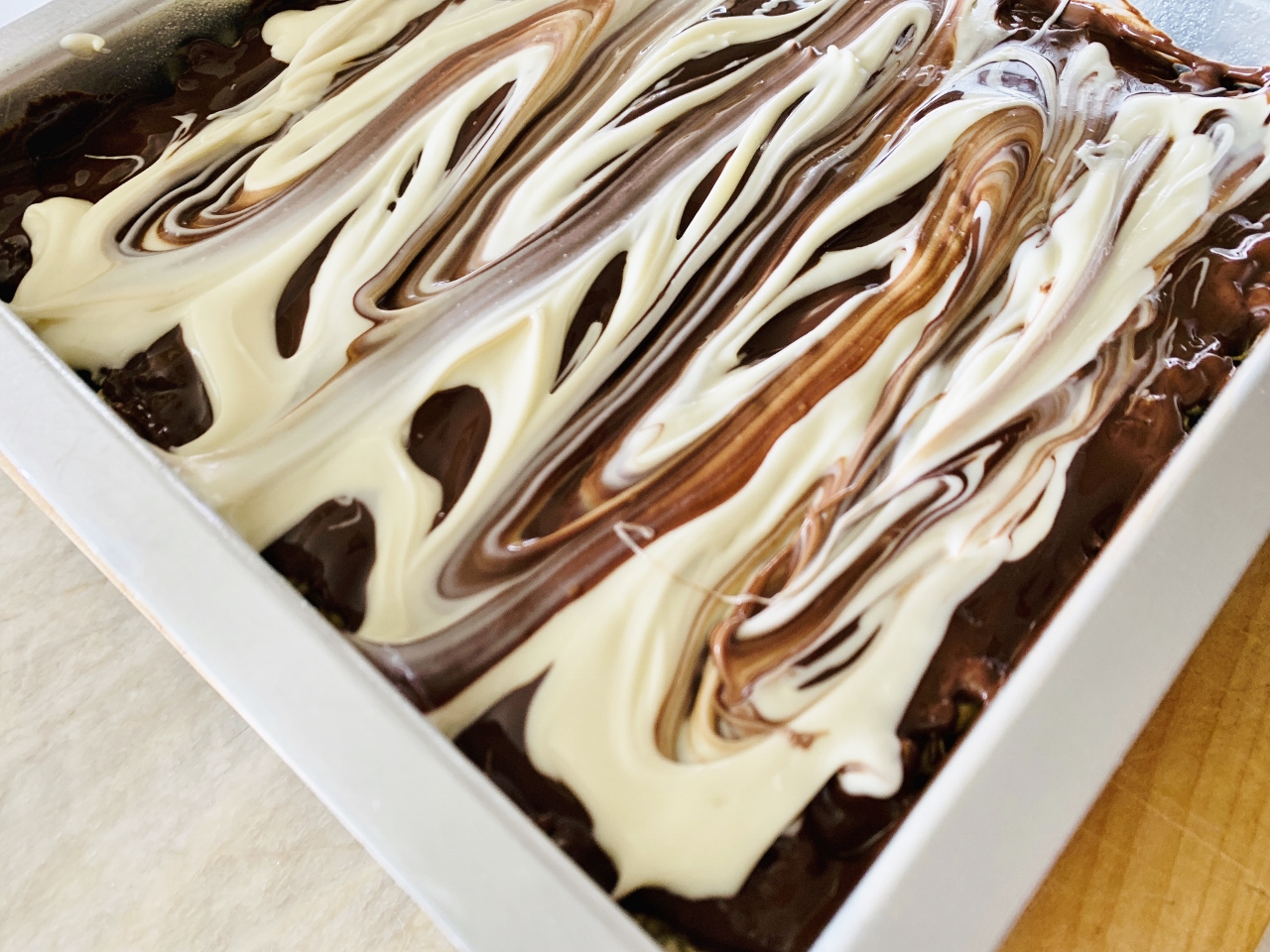 - Remove treats from freezer and spoon white chocolate in thick lines on top of semi-sweet chocolate. Using a fork, run tines across grain, swirling two chocolates together. Place in refrigerator to set up completely before slicing. Enjoy!