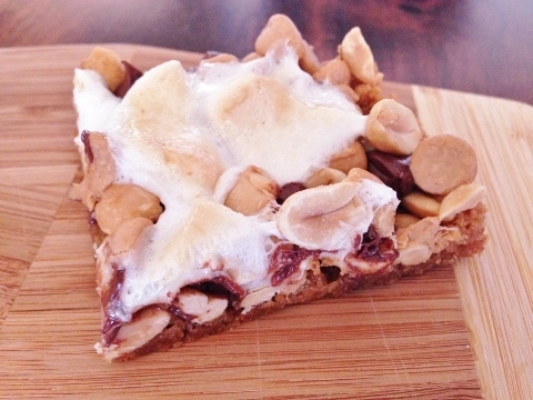 2. Add quartered marshmallows, peanuts, peanut butter chips and semi sweet chocolate chips to pan. Place bars back in oven to bake for 8-10 minutes, or until marshmallows are lightly golden and puffy. Remove bars from oven and let cool completely in pan. Remove bars from pan and slice. Enjoy!