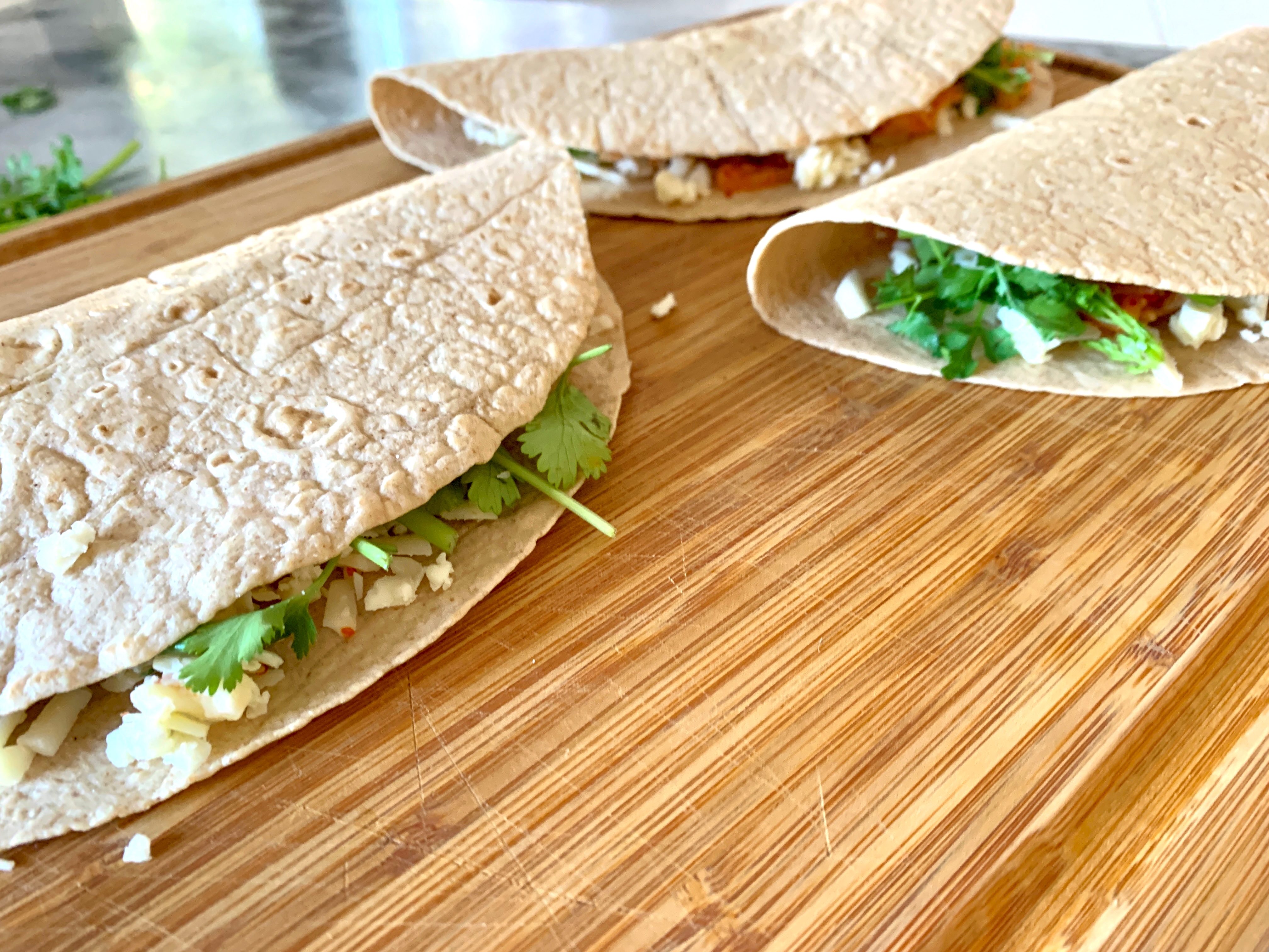 - On a cutting board or work surface, lay one tortilla flat. Fill one side with 2 tablespoons cheese, 1 tablespoon kimchi and a few sprigs of cilantro, fold in half. Set aside and repeat to fill each tortilla.