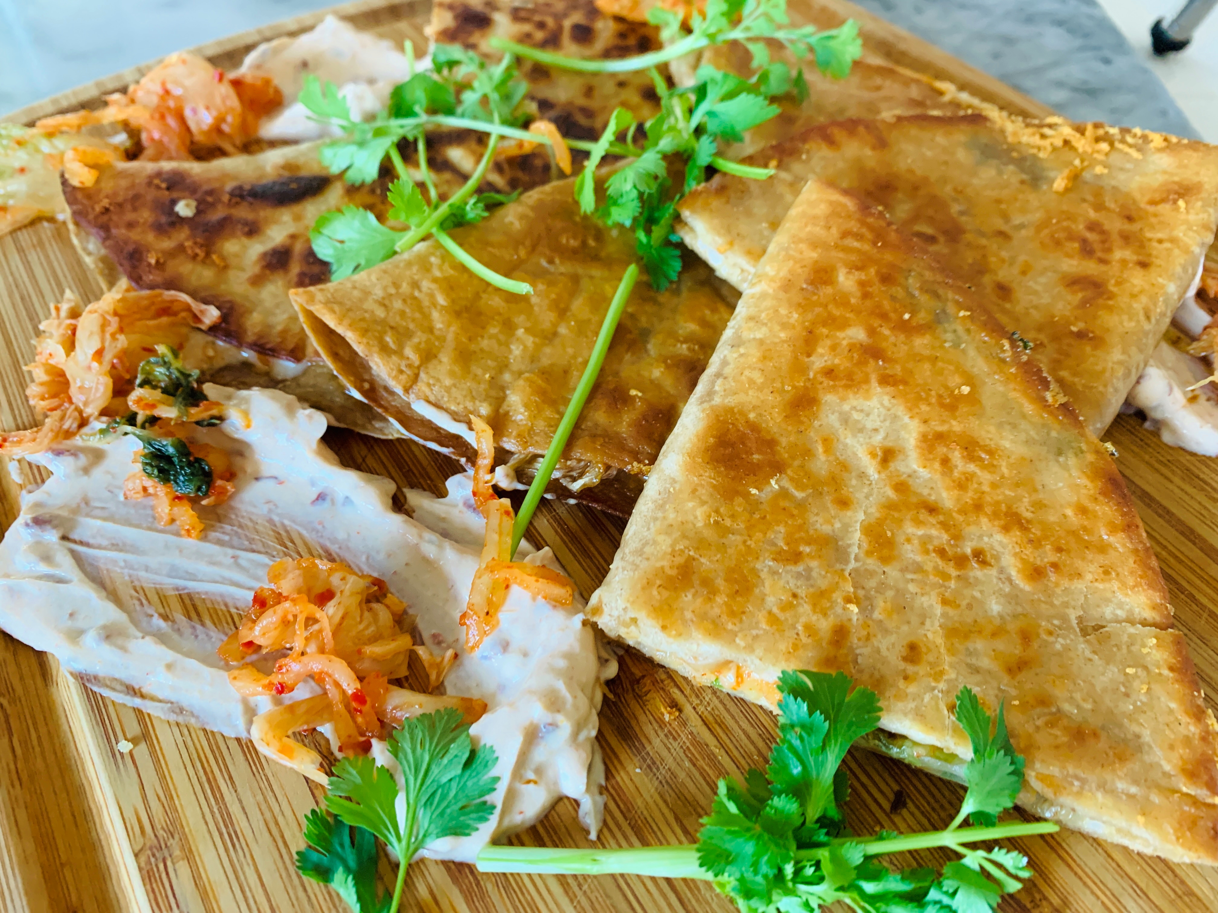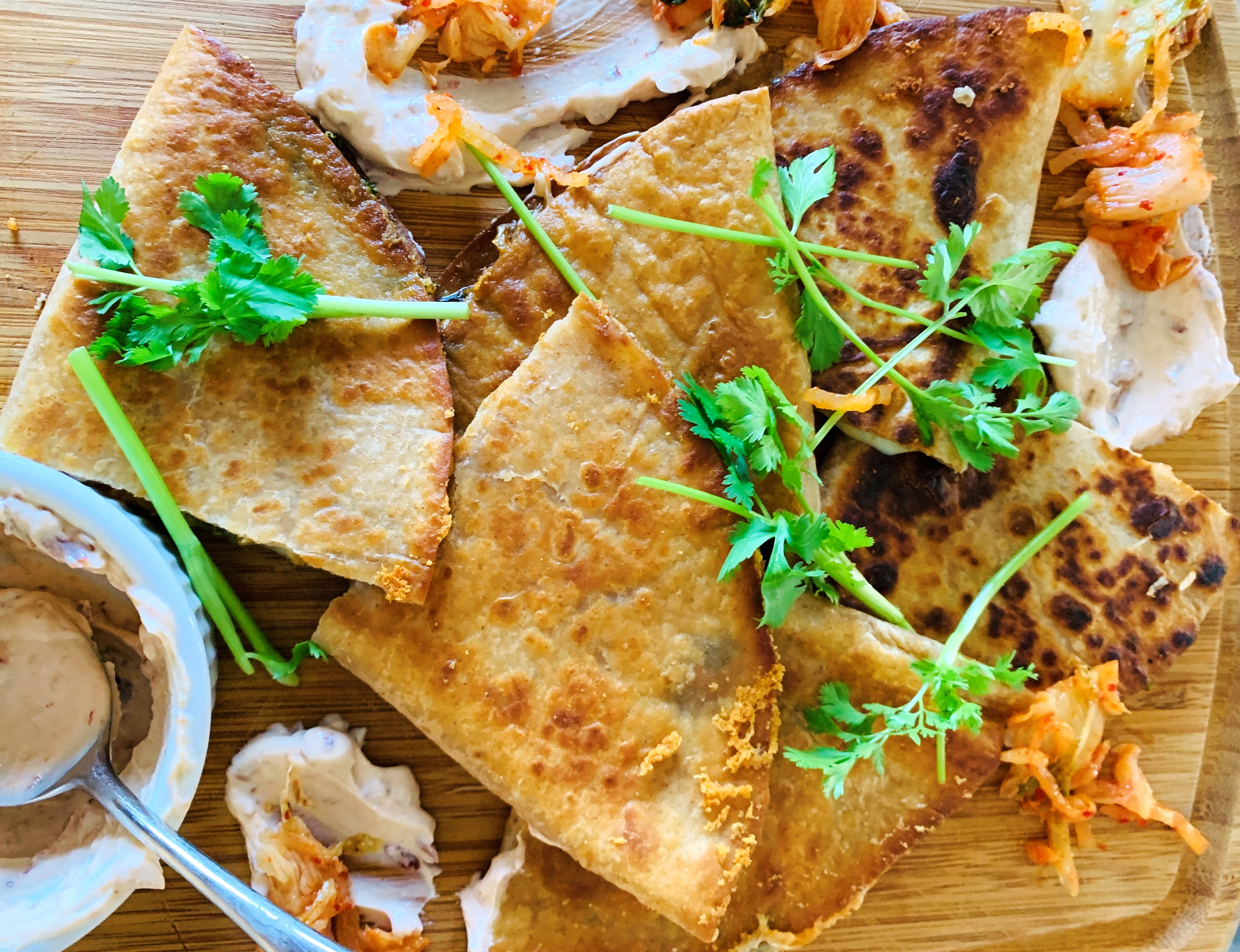 - Slice warm quesadillas in half and layer on serving board or platter. Mix together yogurt, lime juice and minced chipotle. Spoon around edges of board and top with remaining cilantro and kimchi. Serve warm and Enjoy!