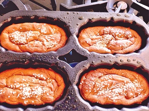 5. Spoon batter into greased loaf or muffin pans. Sprinkle tops of cakes with coarse or regular sugar, if desired. Place pan in oven to bake for 40-50 minutes for teacakes and 18 minutes for muffins.