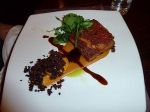 Pork Belly with Sautéed Spinach and Sweet Potato was our entrée of choice. I must say — the best pork belly I have ever eaten. It reminded me of the suckling pig of Spain with a super crunchy skin followed by a thin layer of fat and white meat pork on the bottom. You had to pierce the skin using the tines of your fork to dive into the soft tender center. What an experience!