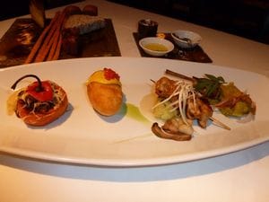 The six-bread platter was the first to arrive on our table. A delectable smattering of mini breads and sticks served with butter, chimichurri and salt from the mines of Peru. We started our meal with an appetizer favorite – Mini Rocoto (red pepper) stuffed with Pork Belly Stew, Skewers of Grilled Chicken with Salsa Verde, Mini Lamb Chop with Sautéed Veggies and Fried Potato Relleno with Ahi Amarillo Sauce. All were fabulous bites of local favorites with a few added fusion touches by Gaston himself.