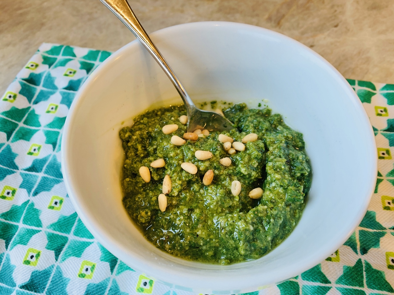 Pesto Sauce is one of those things you can dollop on anything from fish to chicken and roasted vegetables or soups.  The combination of herbs with pine nuts, Parmesan cheese, garlic and a dash of oil makes this spread so versatile, and easy to prepare in your food processor.