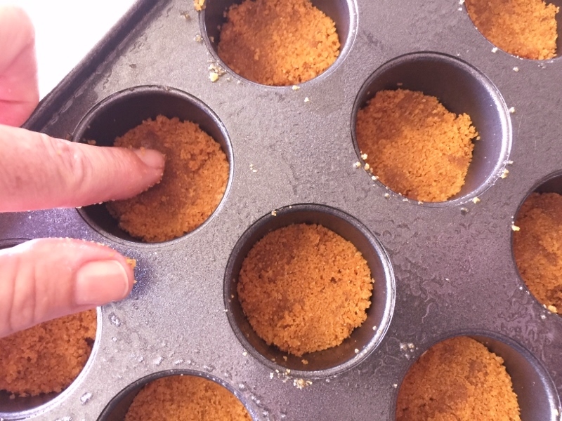 2.  Add 1 tablespoon of crumbs to each cup and press down with fingers.  Bake in oven 8 minutes, remove and let cool while you prepare cheesecake batter.