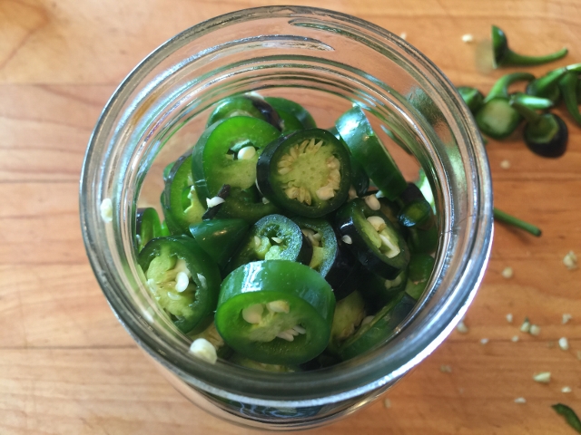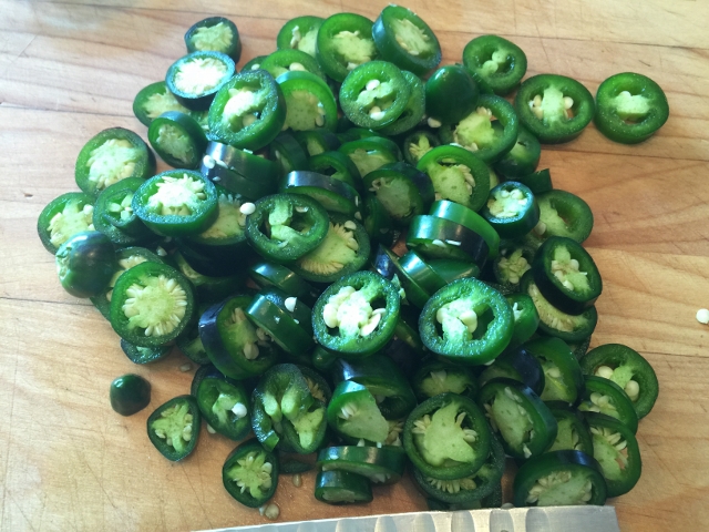 1.  Wash and slice the jalapeno peppers into rings.  Keep most of the seeds intact so you preserve the heat of the pepper when pickling.
