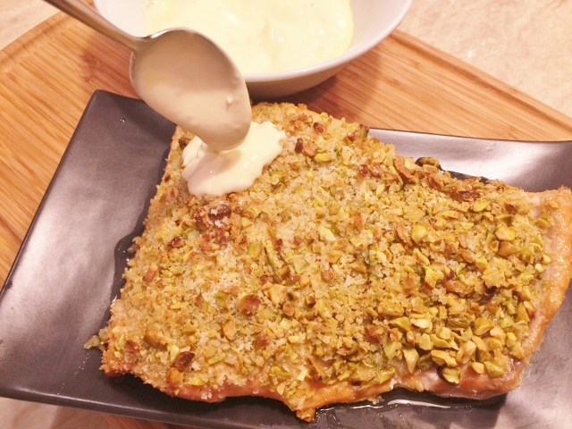 I have a ton of salmon recipes, but there is something nice about roasting it in the oven.  The fish keeps its tenderness, and doesn’t dry out like it has a tendency to on the grill.  Adding a nutty crust on top of salmon preserves the juiciness of the fish, and adds an additional layer of flavor.  Pistachios are an interesting nut to use because it becomes sweet when it cooks, nice with seafood.
