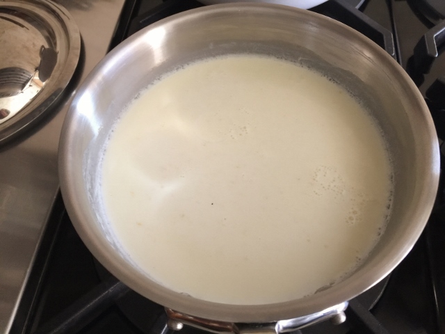 2. In a saucepan over medium heat, add the milk, cream and half the sugar, stir. Cook until lightly simmering. In a small bowl, whisk the eggs and other half of sugar. Add in the xanthan gum and whisk until smooth. Temper the egg mixture with 1/4 cup of warm milk mixture. Pour the warm egg mixture back into the warm milk, while continuing to whisk.