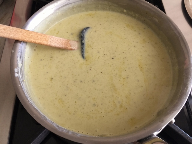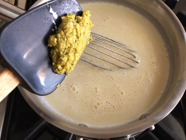 3. Spoon the pistachio paste into the warm milk and whisk until combined. Continue to cook until slightly thickened, about 3 minutes. Remove from heat and let cool in pan for 15 minutes. Pour into a bowl and place plastic wrap on the surface.