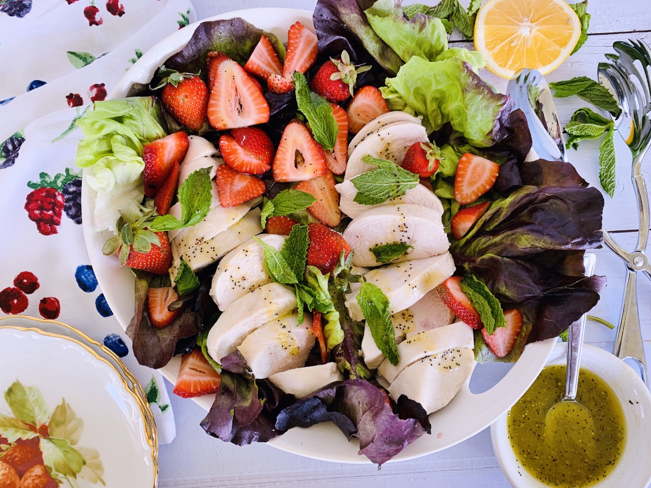 A Poached Chicken Salad with Strawberries and Honey Poppy Seed Vinaigrette makes a delightful meal in minutes and a nice idea to prepare for mom on Mother’s Day.