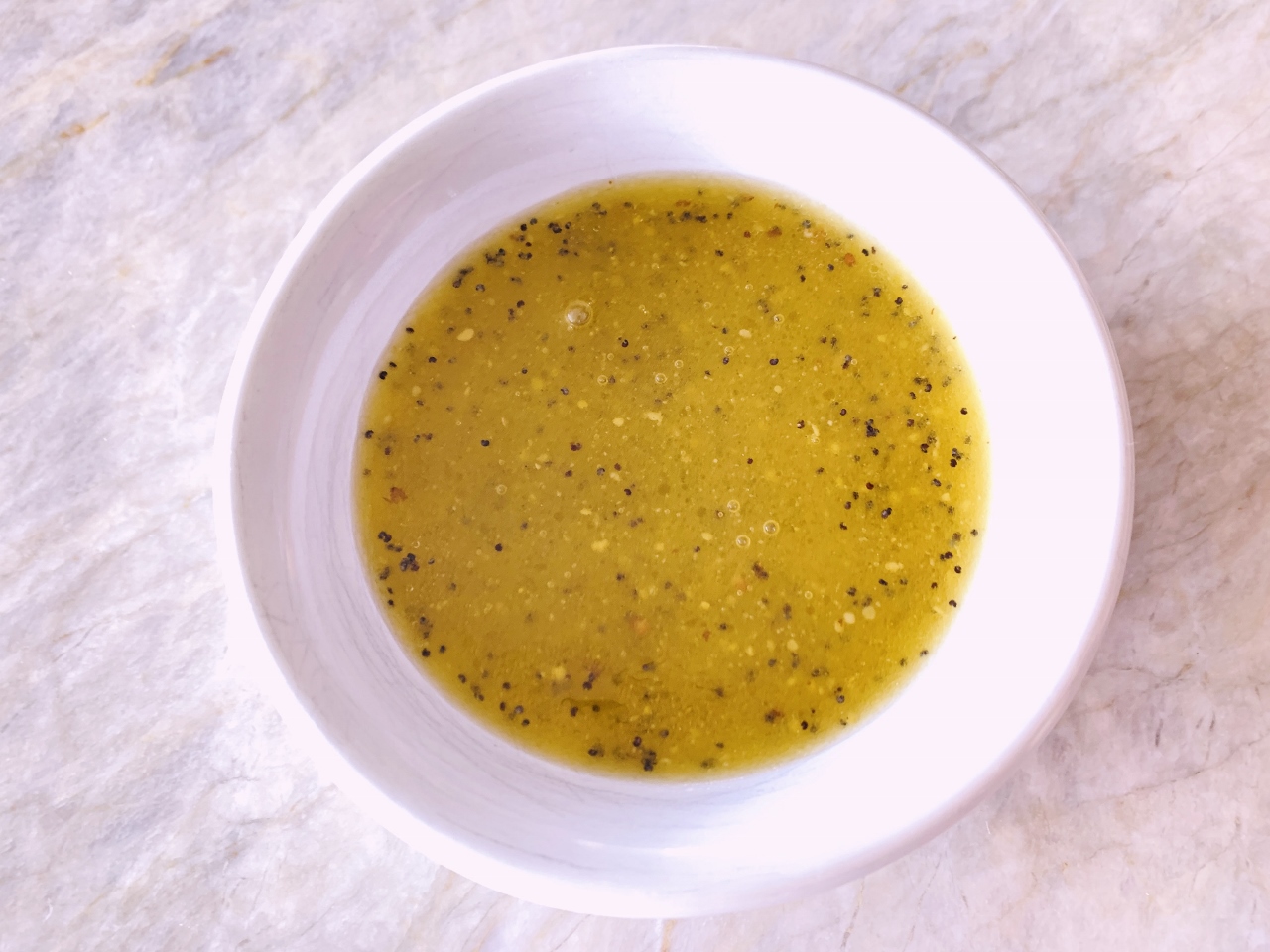 - In a small bowl, whisk together vinegar, honey, mustard and poppy seeds. While whisking, drizzle in olive oil until slightly thickened and add salt and pepper. Set aside.
