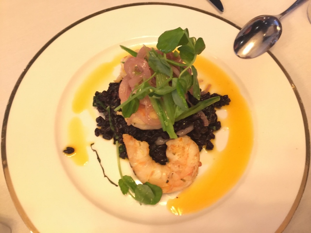 The San Danielle Prosciutto & Burrata — a delicious way to start the evening, however the Wood Fired Prawns with Calabrian Chile Butter and Black Risotto was divine.  The heat from the rice was uniquely satisfying, and gave the dish personality.