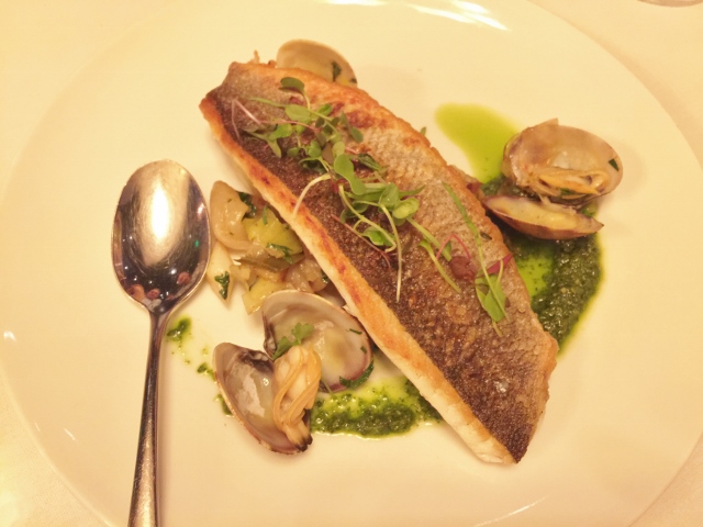 As entrees go – Wood Roasted Branzino with fresh Clams and Leeks was wonderfully prepared, and the salsa verde, added a contrasting tang to the smokiness of the dish.  Loved the crunchy skin!