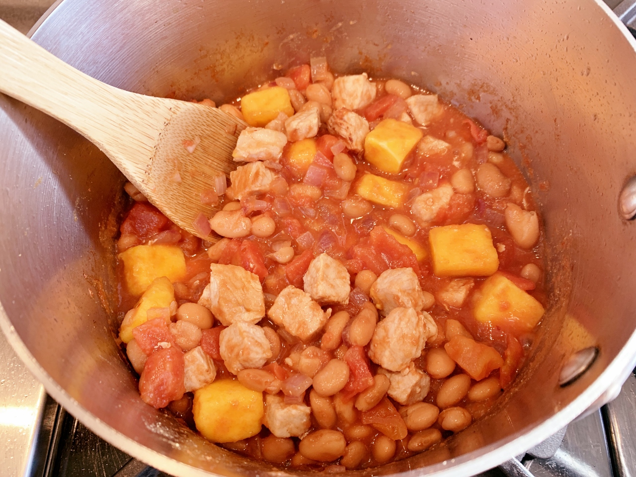 Pork Loin is a very lean cut of meat and dices up nicely to toss into stews. The meat becomes tender over time with a slight chew, which is a preferable contrast when floating around in the same dish with some saucy softened winter squash and beans.