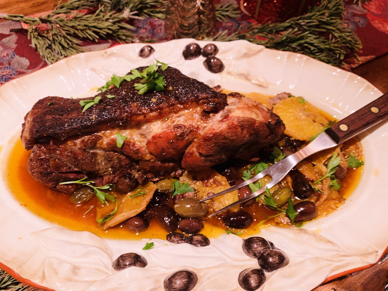 A good dry rub is a nice place to start with most large pieces of meat and I often let the pork hang out in the refrigerator for a few hours before roasting to air dry, which allows the spices to absorb in the meat. I then, place the meat in the oven for a few minutes at high heat and then, reduce the heat down to roast low and slow for several hours. The oranges and olives cook down with the juices from the pork and create the most wonderful pan sauce with no additional cooking required. Serve the roast with potatoes or wild rice and you have yourself one impressive dinner.