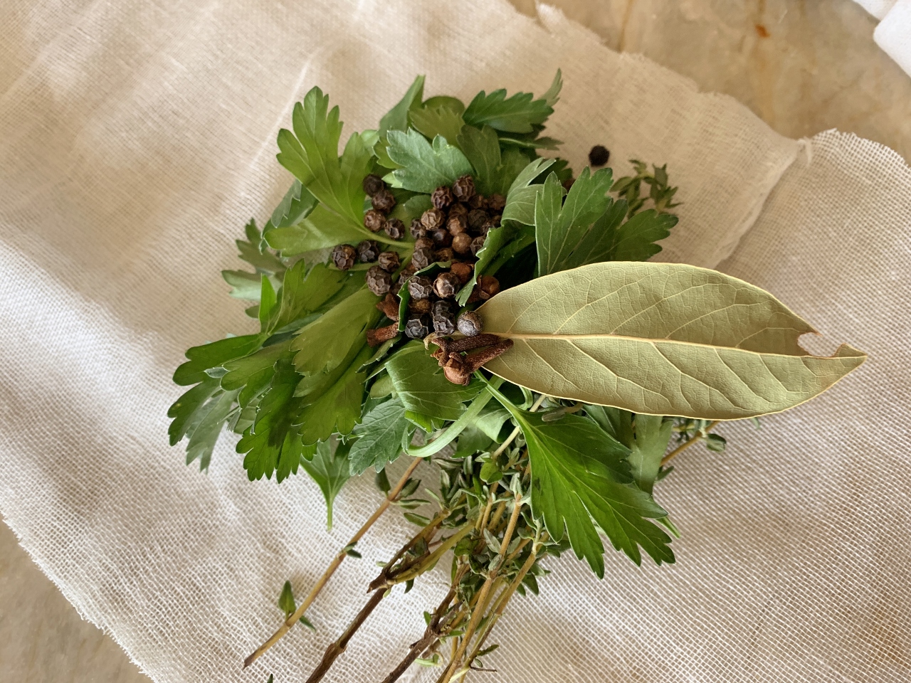 - In a piece of cheesecloth, add bay leaf, peppercorns, cloves, thyme and sage. Roll up and tie with kitchen twine.