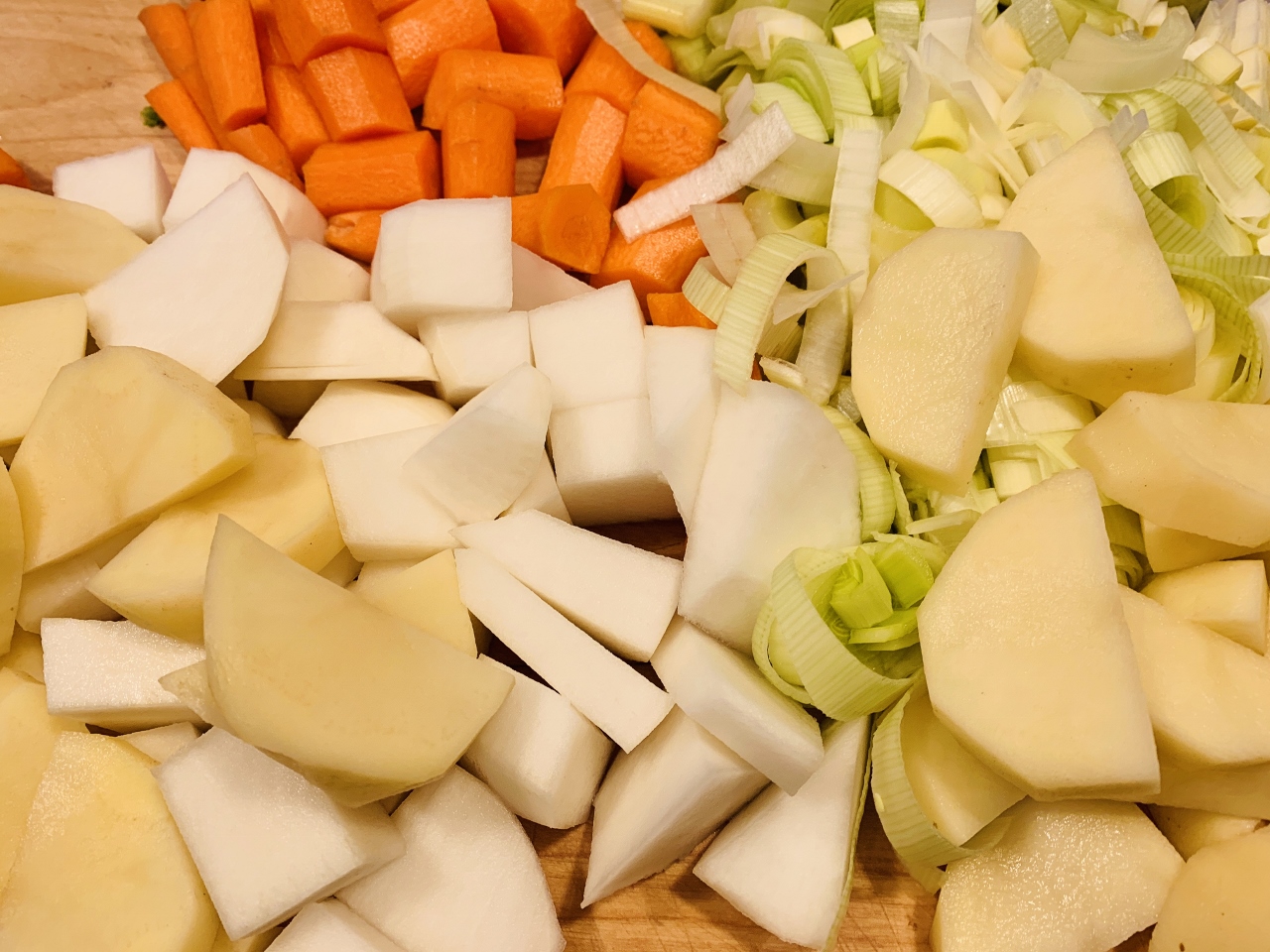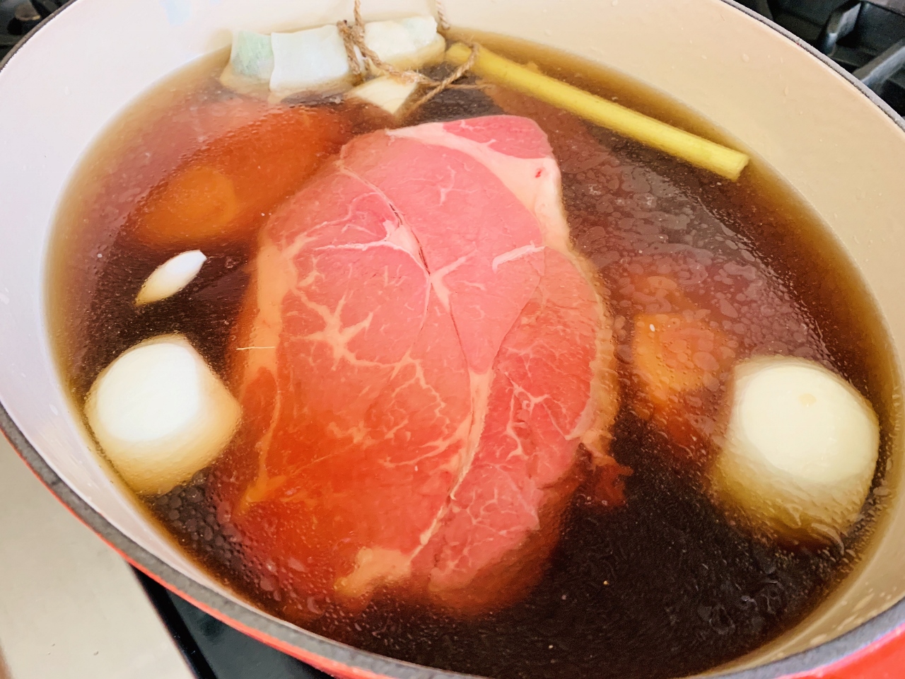 There are several components to Pot au Feu – one being a beef roast of some sort and veal or beef shanks. Bone marrow from the shanks provide richness to the broth – a real umami maker and a variety of roots vegetables like carrots, turnips, potatoes and leeks become the base for the entire bowl.