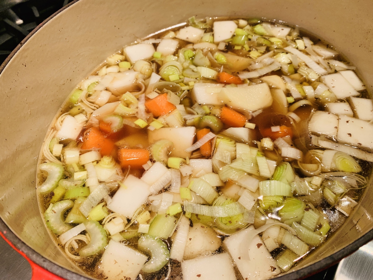- Place pot with broth over medium-high heat and reduce for 15 minutes. Add remaining vegetables and cook for 20 minutes.