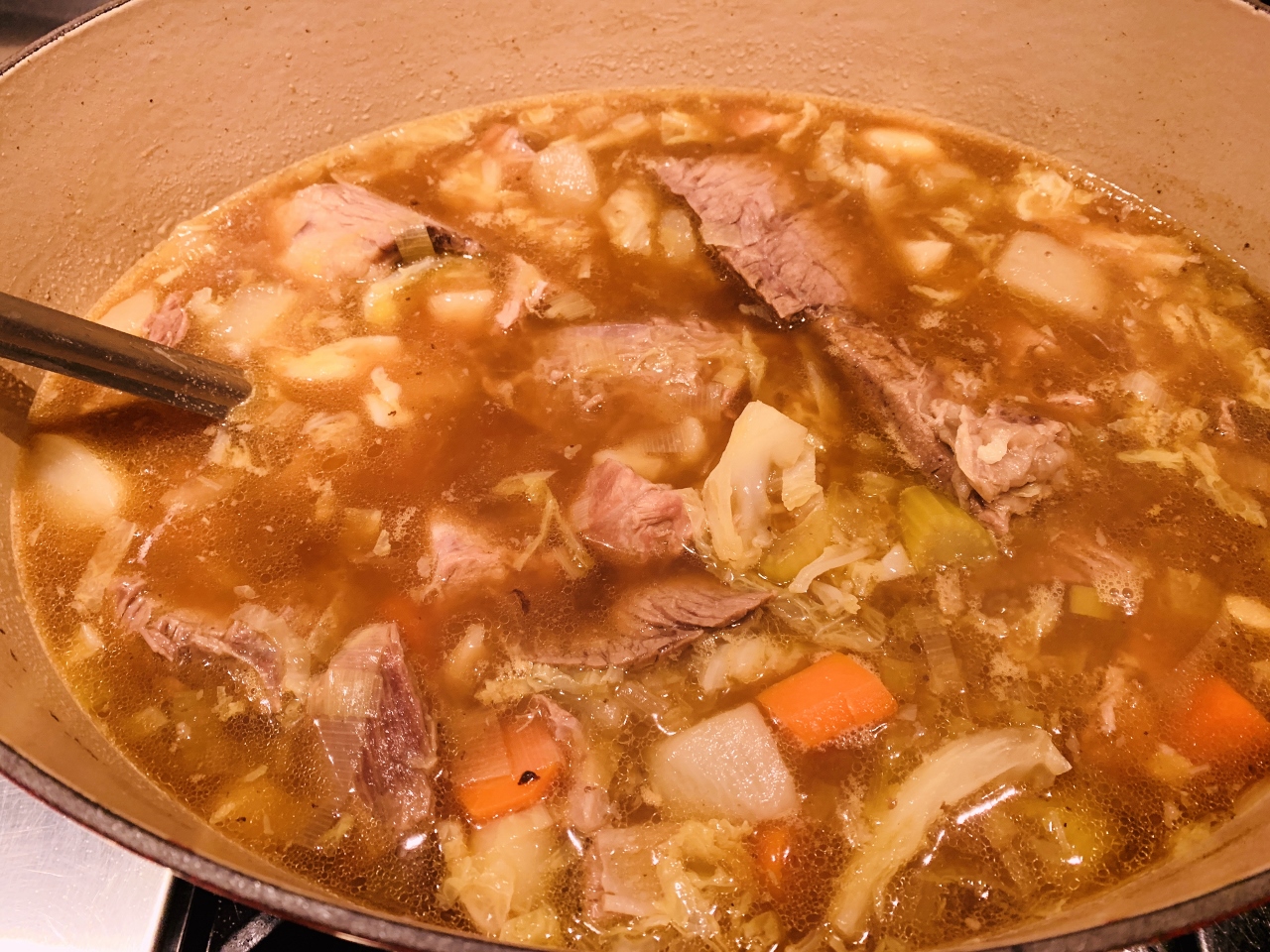 - Slice beef and shanks and add back into pot with vegetables. Salt and pepper to taste and simmer for 8 minutes.