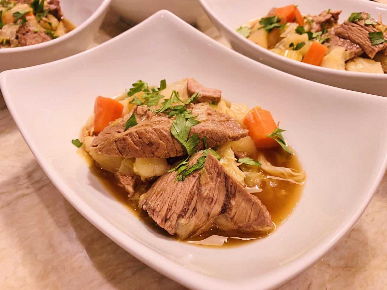 - Slice beef and shanks and add back into pot with vegetables. Salt and pepper to taste and simmer for 8 minutes.