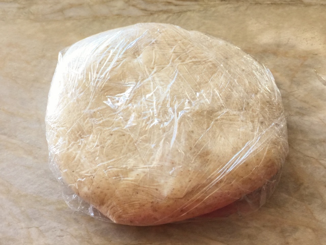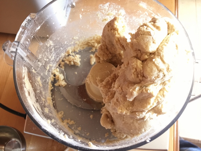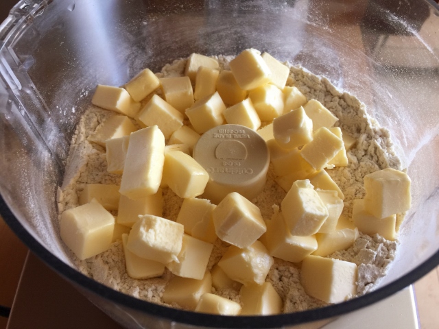 2. In a food processor add flours, cheese and salt. Pulse 5 times until combined. Add diced butter and pulse again 10 times, or until coarse crumbs. While the processor is running, add vinegar and water. Just as the dough begins to come together, stop and remove dough. Wrap in plastic and refrigerate for 30 minutes.