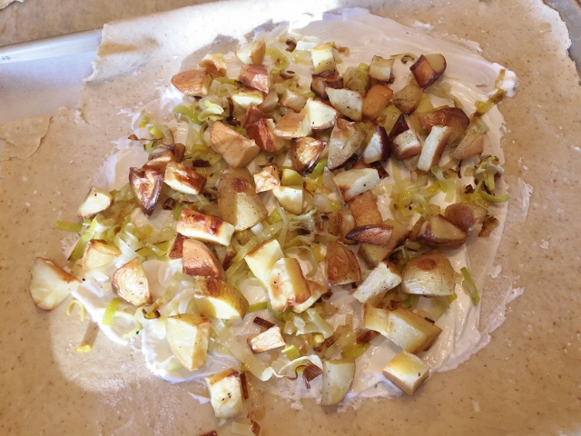 3. Remove dough from plastic wrap and roll out onto a lightly flour-dusted surface. Place dough onto a sheet pan lined with parchment paper. Spread sour cream over the top of dough, leaving 2-inch edges clean. Spoon half the leeks and potatoes over crust. Break up bacon and sprinkle half over the top. Repeat with leeks, potatoes and bacon. Fold edges up over the filling, about 2-inches. Place tart in the refrigerator for 20 minutes.