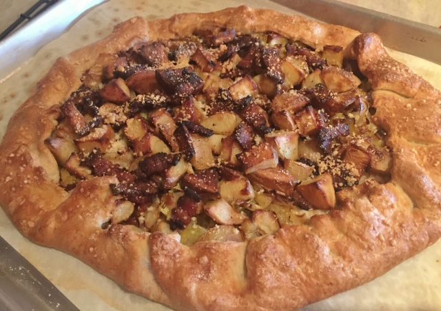 The entire savory dough is made in the food processor for a quick and easy approach. After rolling and filling the tart with roasted potatoes, sauteed leeks and crisp bacon, you have yourself a tasty masterpiece.