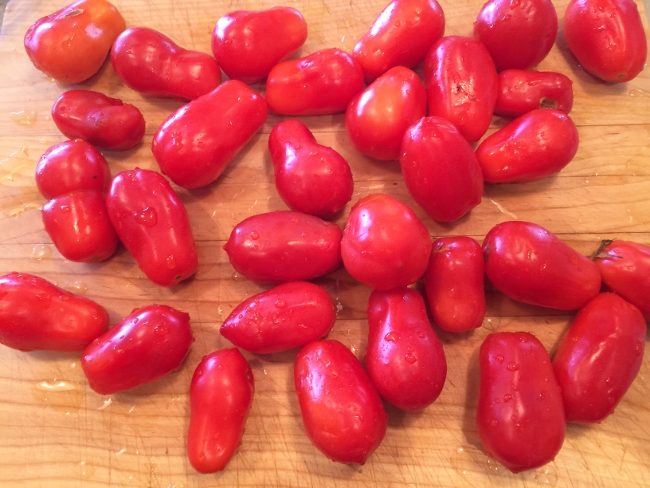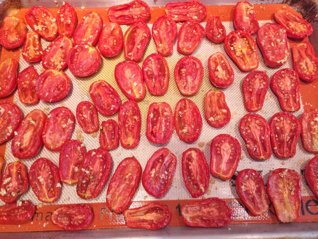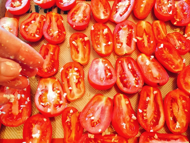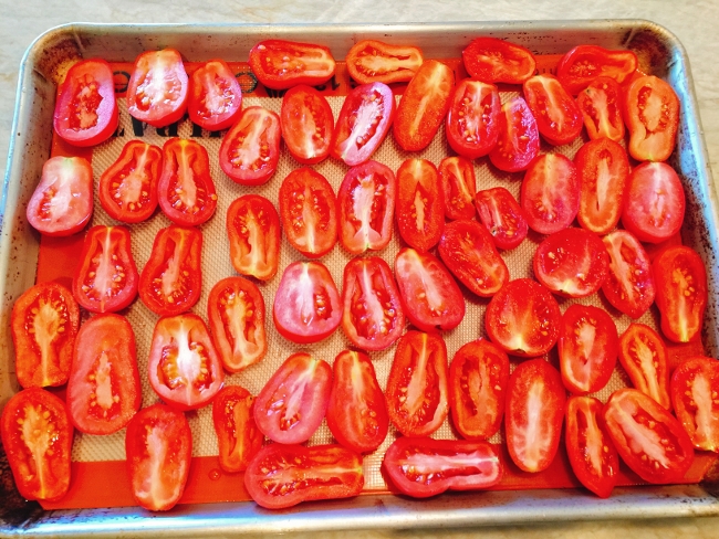 1. Preheat oven to 300 degrees. Wash tomatoes and slice in half. Place tomatoes cut side up on a silpat or parchment lined baking sheet.