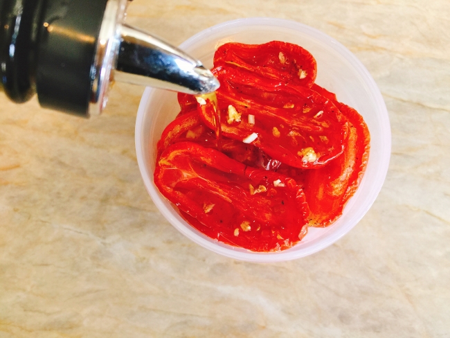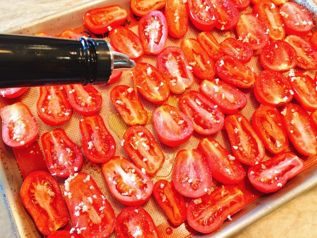 3. Drizzle tops of tomatoes with olive oil and place in oven to roast for 2 1/2 – 3 hours.