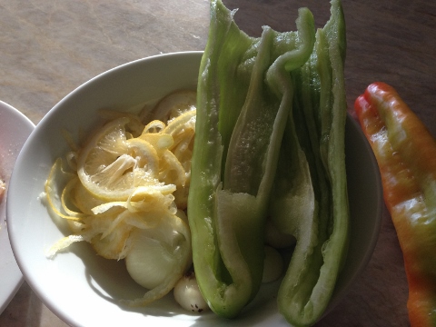 2. Next, remove skins from cipollini onions, slice lemon very thinly and slice pepper in half and remove the seeds. Drizzle the lemon and veggies with olive oil and toss with a pinch of salt and pepper.