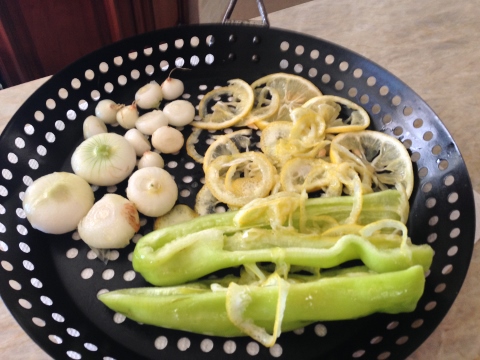 3. Place the lemon slices and veggies in a grill pan. If you don’t have a grill pan you can use heavy duty foil punctured with a few holes to allow charring.