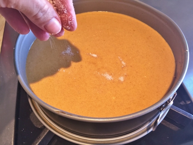 2. To make filling – cream together on high speed, cream cheese, butter, brown sugar and granulated sugar, about 3 minutes. Add vanilla, pumpkin pie spice, pumpkin and eggs. Mix on medium speed until smooth, about 2 minutes. Pour filling on top of crust.
