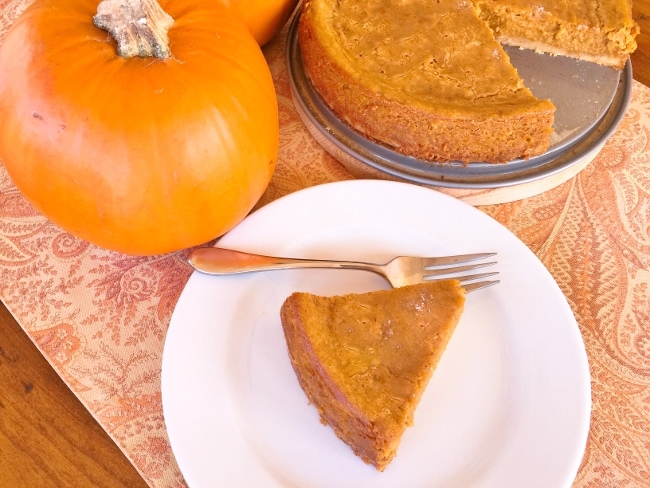 This cake recipe not only has a creamy center, but it has a buttery crust to match. You start by pressing the crumbs into a pan with your fingers, and then gently pouring the smooth filling of cream cheese and pumpkin over the crust. The top of the cake is dusted with a little sugar and pumpkin pie spice for a crackled crust after baking, and you can serve this pumpkin cake at room temperature, or cold, right out of the refrigerator. I think you’ll adore it’s simplicity, and ponder whether it’s more like a pie, or a traditional pumpkin cake that you just prepared?