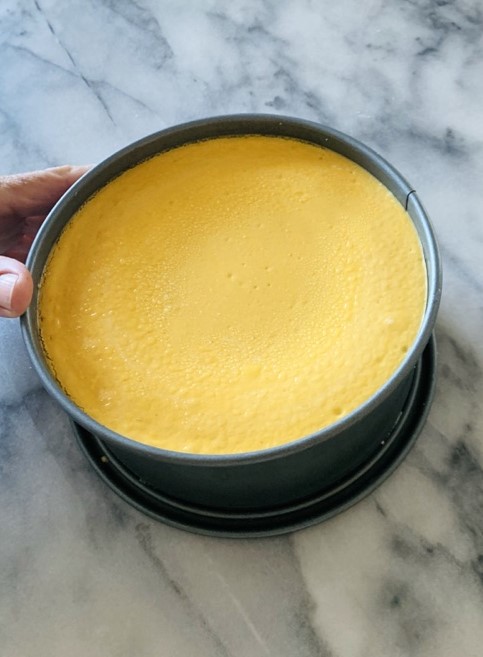 6. Pour filling into crust and place in a pan.  Fill with hot water, until 1/3 up sides of cheesecake.