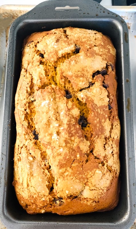 Pumpkin bread is a recipe that many of us have in our repertoire of baking and adding chocolate chips to the mix, gives it a special something that most people enjoy.  A traditional quick bread is made by creaming butter, sugar and eggs and adding flavorings like pumpkin and vanilla, then carefully mixing in the dry ingredients.  But in my recipe, sprinkling granulated sugar over the top gives this pumpkin bread a crevice looking top that’s not only lovely, but adds a slight crunch.  I think baking with pumpkin can be the most autumnal thing to do in the month of October — it puts you in a fall-lie spirit.